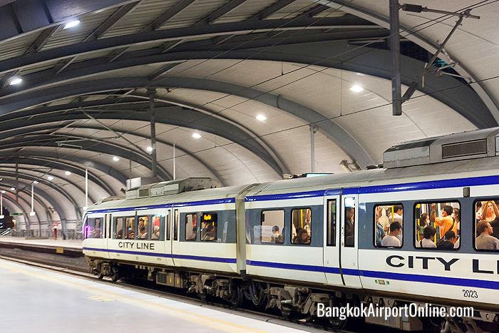 You can board the train in the basement of the airport. The express train will take you directly to Makkasan Station in about 15 minutes. From there you can take the City Line (the local line of the Airport Rail Link) two stops to Phayatai Station, where you can connect to the Skytrain.